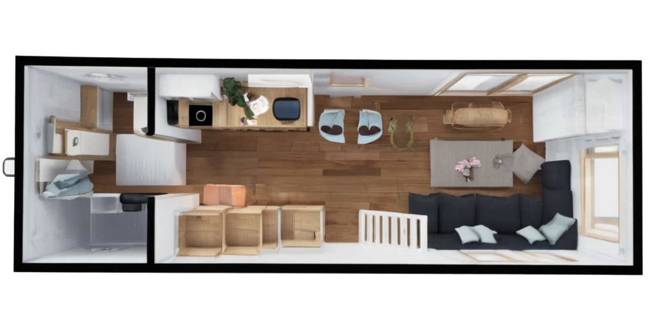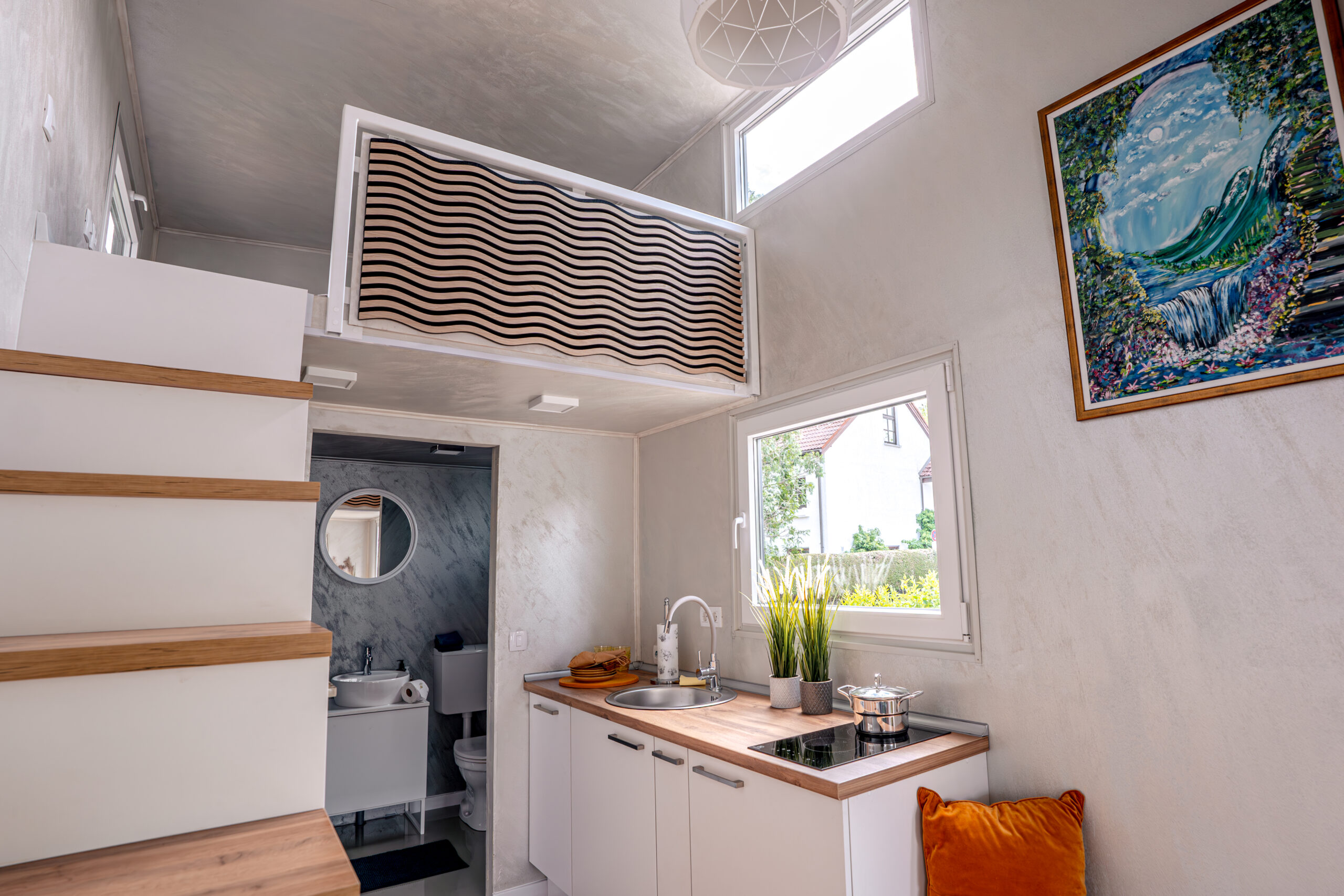 Unser modernes Loft-Tiny House auf Rädern bietet 26,17 m² Wohnfläche, die perfekt für nachhaltiges und flexibles Wohnen ausgelegt ist. Es ist mehr als nur ein kleines Haus – es ist ein echtes Zuhause, das Komfort, Flexibilität und Umweltbewusstsein in sich vereint. Für moderne Nomaden und umweltbewusste Individualisten, die Wert auf Nachhaltigkeit und Mobilität legen, ist unser Tiny House die ideale Wahl.